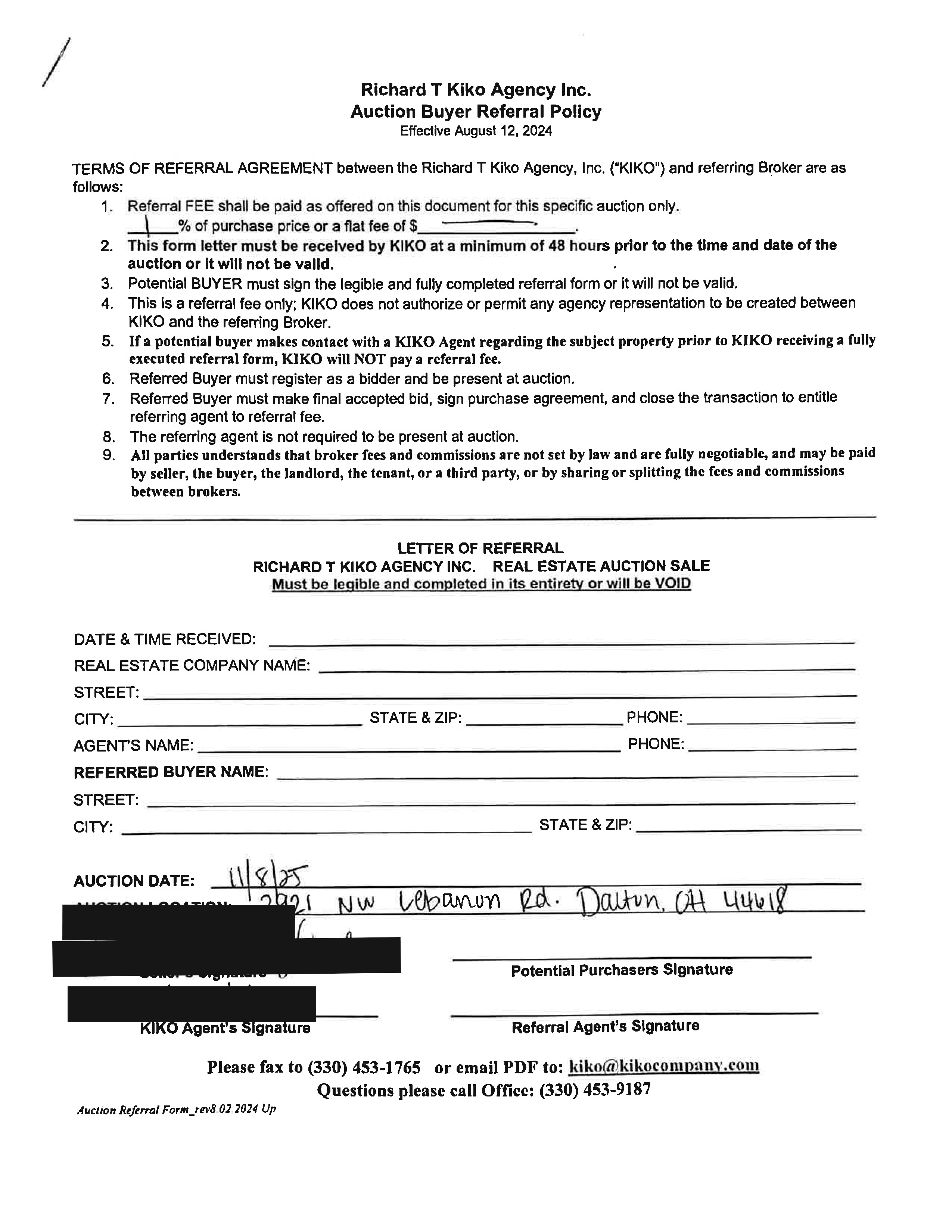 10% down auction day, balance due at closing. A 10% buyer’s premium will be added to the highest bid to establish the purchase price. Any desired inspections must be made prior to bidding. All information contained herein was derived from sources believed to be correct. Information is believed to be accurate but not guaranteed.